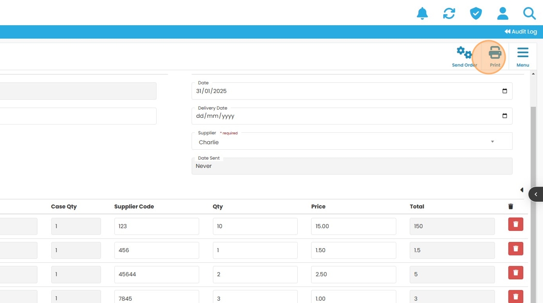 12. Click Print to generate PDF to send to the supplier.