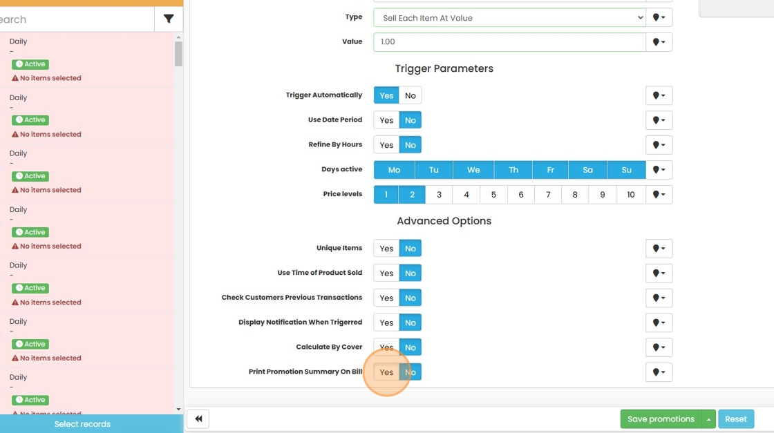 31. Choose whether the promotion should print a promotional breakdown on the bill.