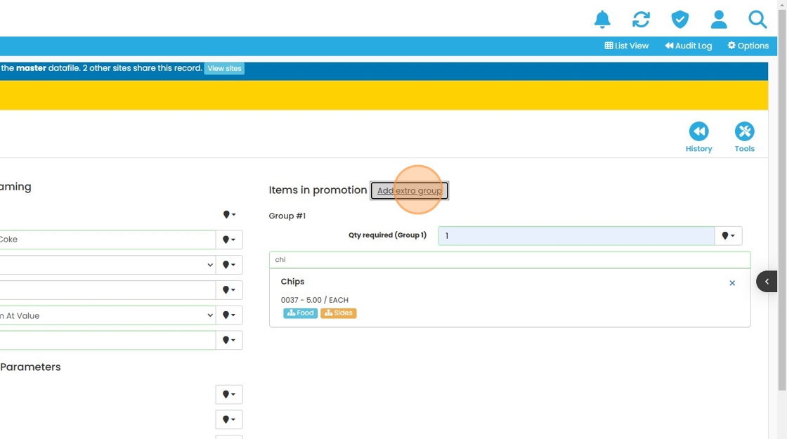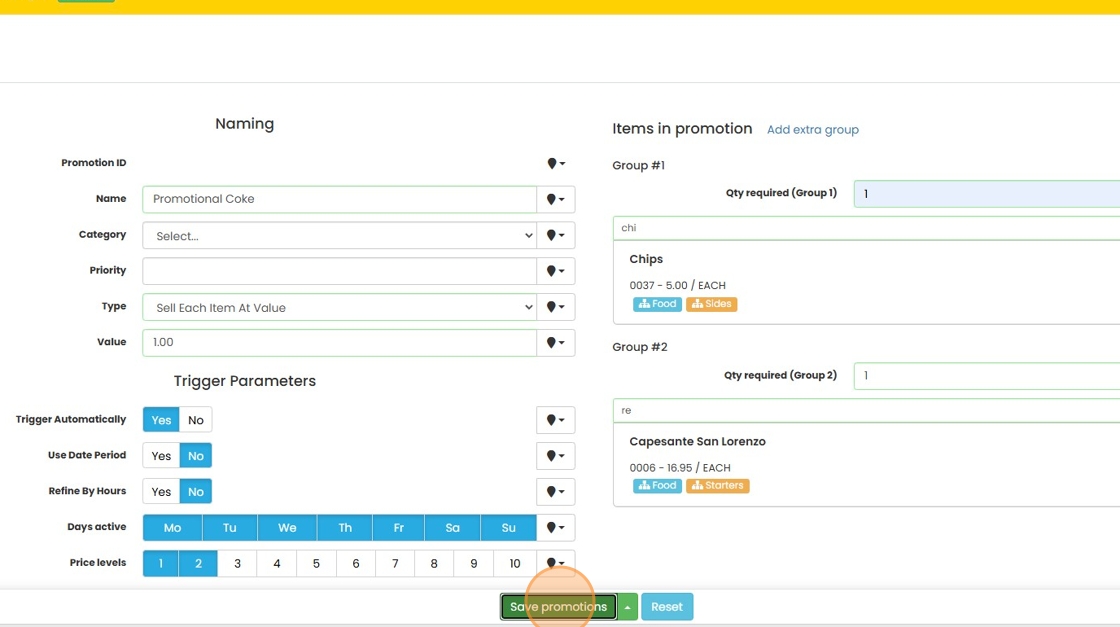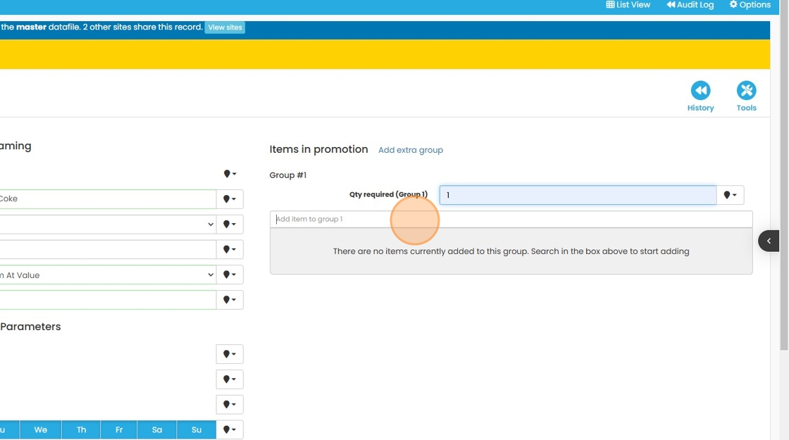 33. Add the relevant items for the promotion in the “Add item to group 1” field.