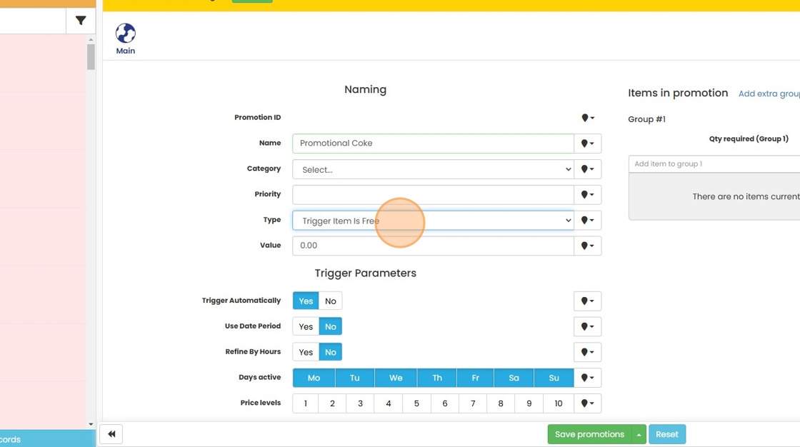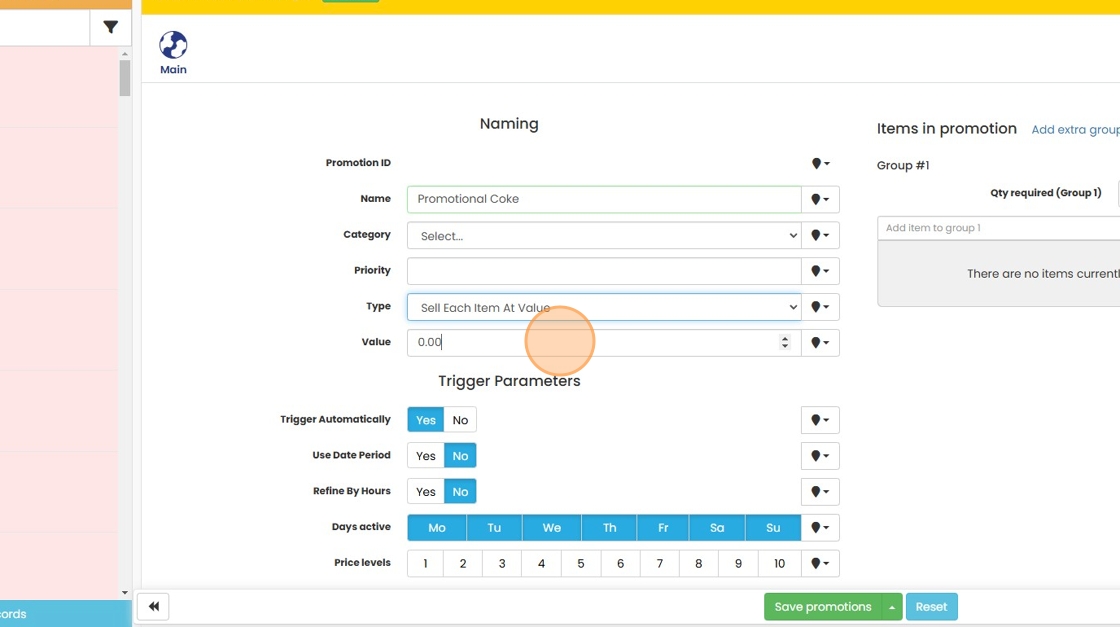 16. Click the “Value” field for this promotion the value is 0.00 as the trigger item is free.